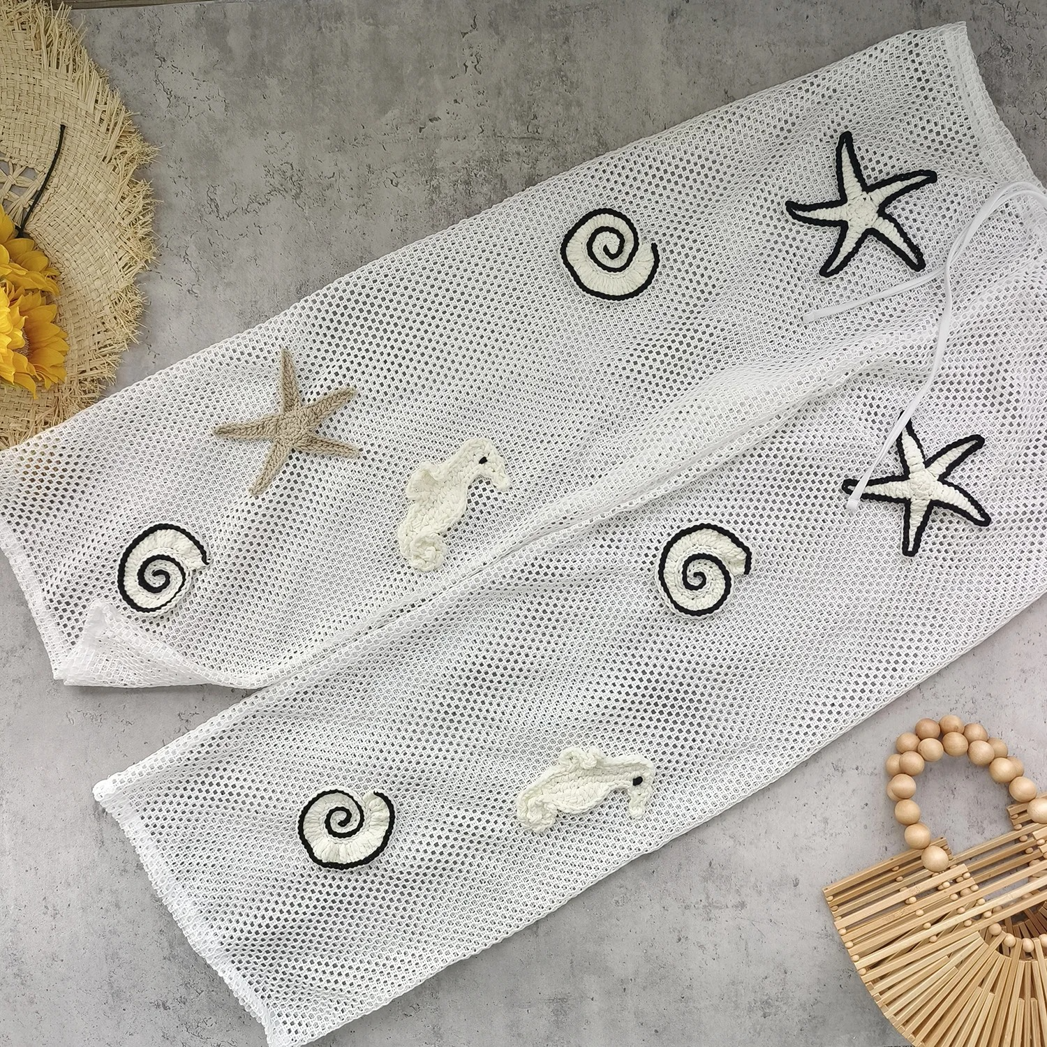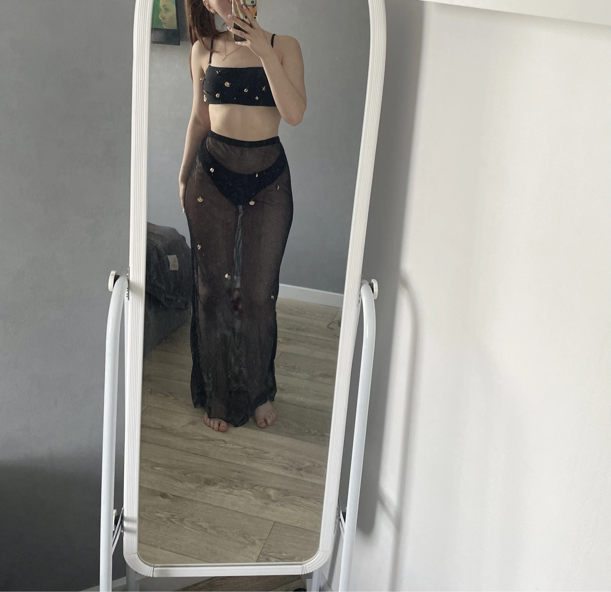 🌴 This set pairs a sleek bandeau bikini top and bottom with flowing mesh pants, giving you a graceful silhouette perfect for pool parties or seaside dinners.