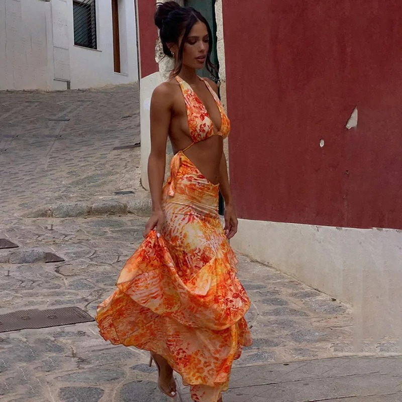 🌼 Make waves with the Eazyfy™ Halter Long Ruffle Skirt Set—romantic ruffles and supportive fit for a truly show-stopping vacation look.