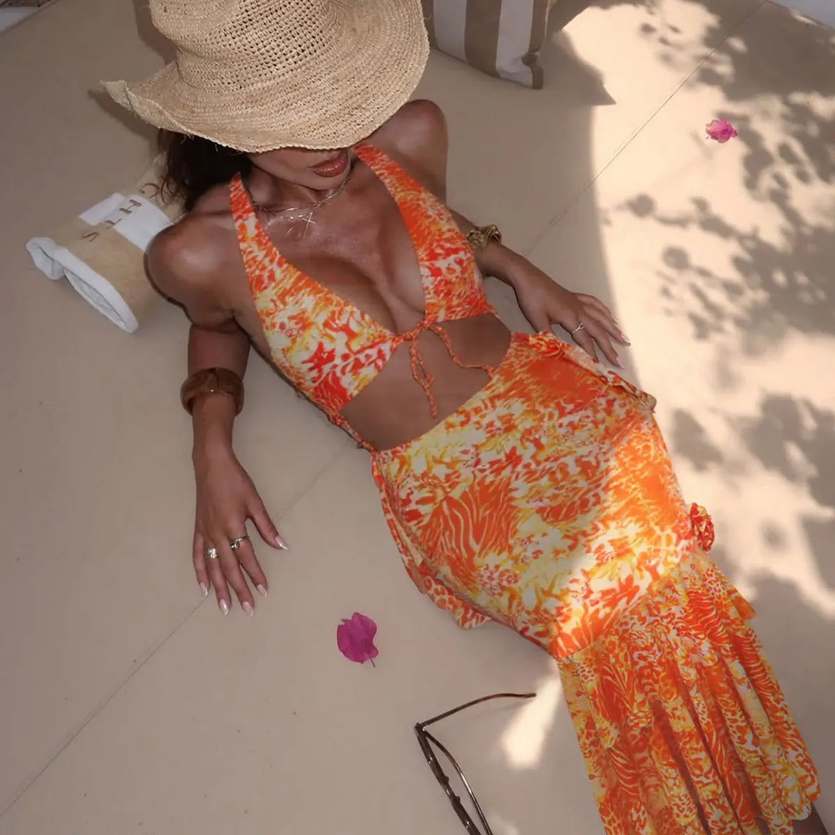🌴 Featuring a secure halter bikini top and a dramatic long ruffle skirt, this set blends retro charm with modern femininity.
