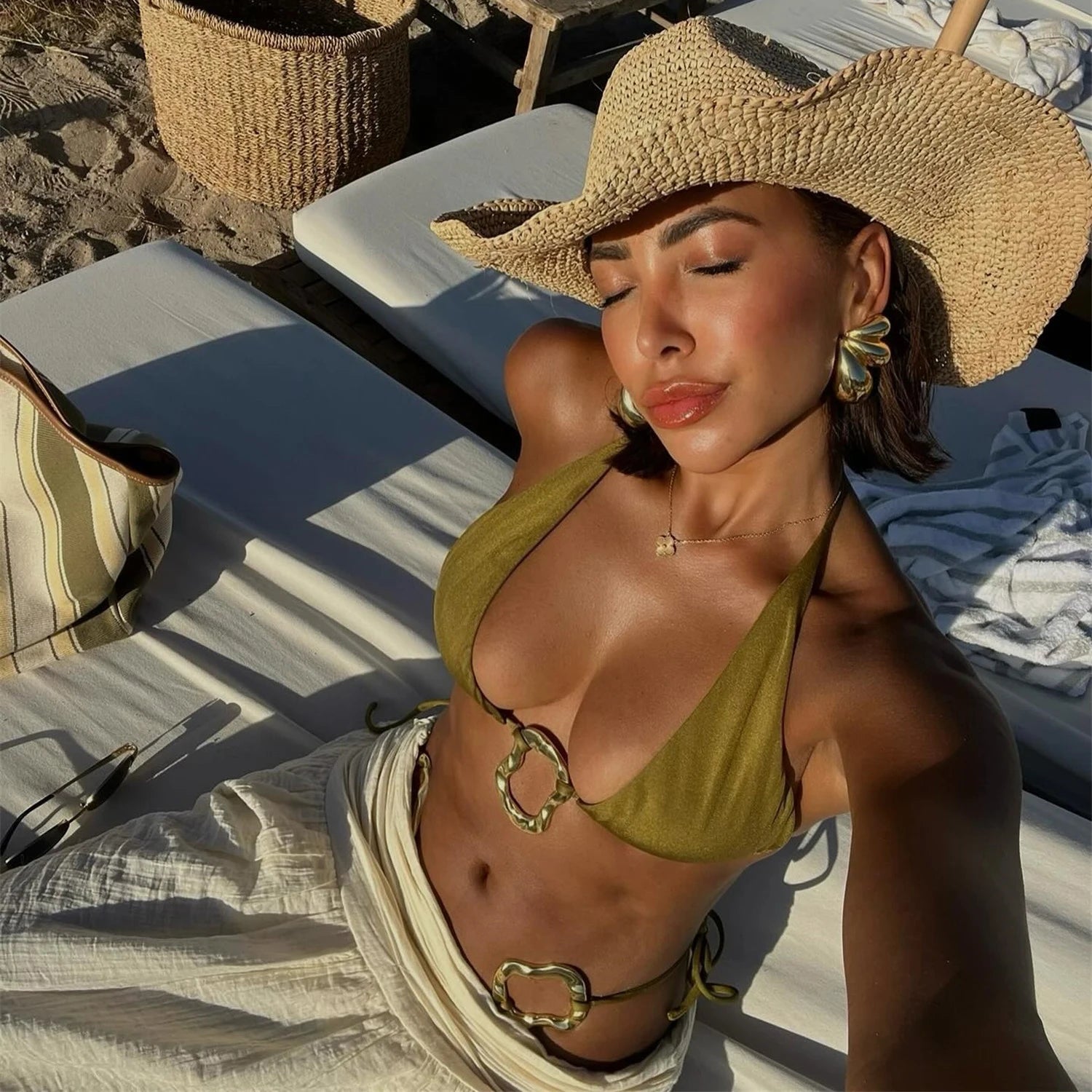🌴 Featuring metallic ring links on the bikini top and sides, paired with a flowing long skirt, this set makes every beachside entrance unforgettable.